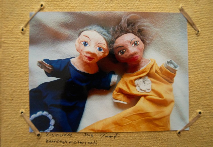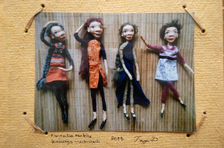 Käsinukkeja. Kierrätys kangasta ja sidosaineena vehnäjauholiimaa.
