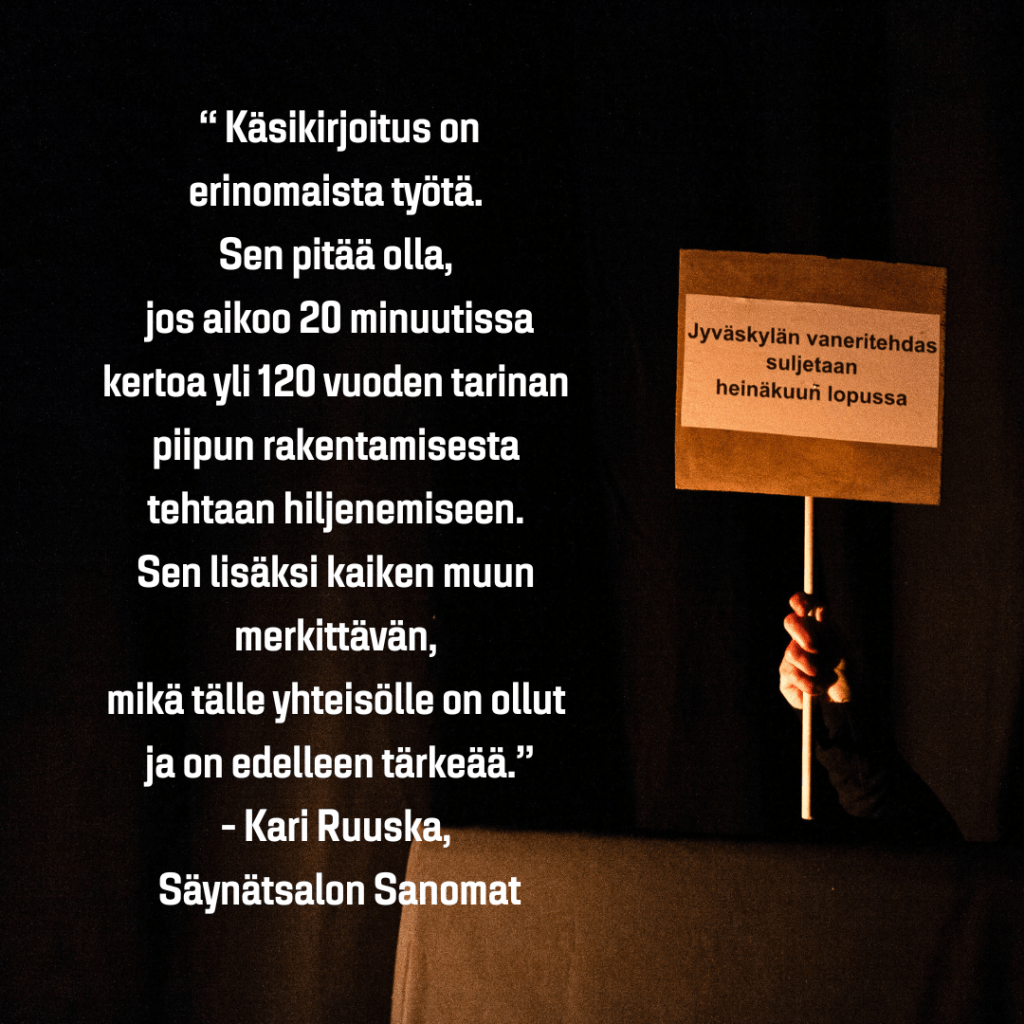 Taidetila Parvi:ssa Kerran minäkin kävin täällä – nykynukketeatteriesitys tulkitsee dokumentaarisen aineiston pohjalta mennyttä ja tulevaa Säynätsaloa tehtaan piipun ympärillä. Esityksen lähtökohtana on ollut taiteilija Iikka Hackmanin muraali Kerran minäkin kävin täällä. Esitys vie matkalle menneeseen, mutta samalla se kehottaa päästämään siitä irti ja katsomaan tulevaan.